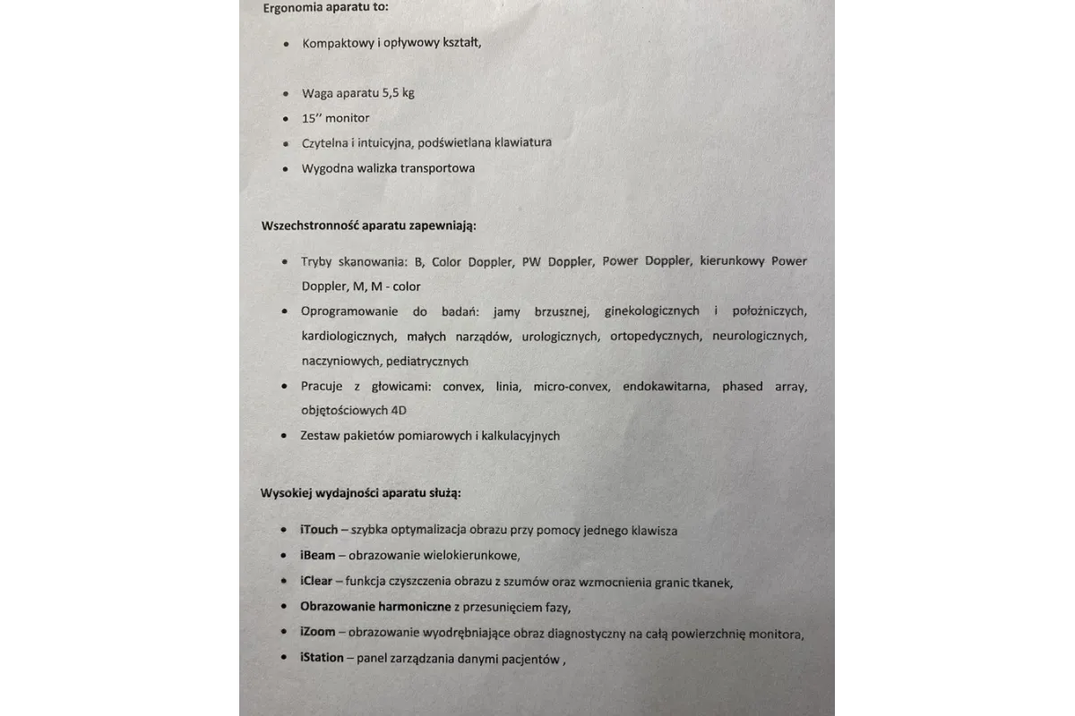 | Wyposażenie | 2 głowice – szczegółowe dane techniczne i opis głowic znajdują się na zdjęciach ogłoszenia Aparat Mindray M7 Drukarka medyczna Mitsubishi Około 30 rolek papieru do drukarki Stolik pod aparat z kółkami (mobilny) Walizka transportowa (oryginalna Mindray) Zestaw dokumentacji i przewód zasilający |